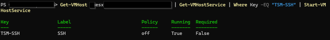 Get-VMHost Monexi| Get-VMHostService | Where Key -EQ « TSM-SSH » | Start-VMHostService
