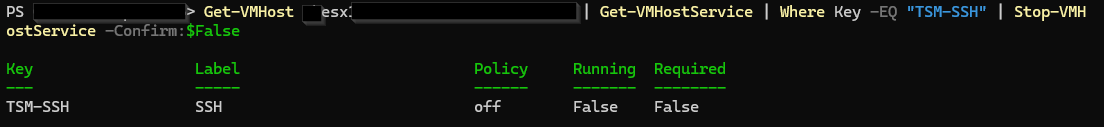 Get-VMHost monex | Get-VMHostService | Where Key -EQ « TSM-SSH » | Stop-VMHostService -Confirm:$False